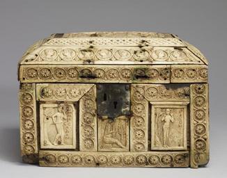Keywords: Byzantine - Box with Scenes from the Fall of Adam and Eve and the Story of Joseph - Walters 71295.jpg The front of this casket depicts the Fall of Adam and the Temptation of Eve flanking the Sorrowing Adam below the lockplate A fourth plaque on the back of the casket portrays Adam hiding behind a tree and covering his nudity The large rectangular plaque set into the casket's lid shows the Old Testament patriarch Jacob ordering his son Joseph to follow his brothers and the Angel of the Lord guiding his way These Old Testament images must have been intened as moral examples for the box's owner It was probably used in a private home for the safekeeping of valuables In Constantinople where urban life especially in the middle Byzantine period 843-1204 surpassed that of any western center luxury items such as boxes made of ivory and bone were in great demand and produced serially A number of details point toward such a system of manufacture many extant boxes have similar dimensions and often the borders were cut to size and used as fillers The plaque on the lid of this box with biblical scenes is smaller than the allotted space a sign that it was not made to measure Likewise the presence of peg holes prepared but not drilled through like those in the upper left border indicates that the plaque was part of a stockpile and not custom made These techniques allowed workshops to produce more affordable wares thus meeting the needs of a larger market The wealthier patrons might order a custom-made box covered in ivory plaques consumers of more modest means could purchase a box decorated with the plaques and strips of carved bone that the workshop kept in stock century 10 11 Medieval bone ivory wood cm 18 7 27 8 17 9 accession number 71 295 7841 Henry Walters city Baltimore Walters Art Museum Henry Walters Acquired by Henry Walters 1926 Translation Jacob Sending Joseph out to His Brothers Angel of the Lord The Transgression of Adam The Snake Speaking to Eve Early Christian and Byzantine Art Baltimore Museum of Art Baltimore 1947 place of origin Constantinople present-day Istanbul Turkey <gallery> File Byzantine - Box with Scenes from the Fall of Adam and Eve and the Story of Joseph - Walters 71295 - Back jpg File Byzantine_-_Box_with_Scenes_from_the_Fall_of_Adam_and_Eve_and_the_Story_of_Joseph_-_Walters_71295_-_Interior_Top jpg File Byzantine_-_Box_with_Scenes_from_the_Fall_of_Adam_and_Eve_and_the_Story_of_Joseph_-_Walters_71295_-_Left jpg File Byzantine - Box with Scenes from the Fall of Adam and Eve and the Story of Joseph - Walters 71295 - Right jpg File Byzantine - Box with Scenes from the Fall of Adam and Eve and the Story of Joseph - Walters 71295 - Three Quarter jpg File Byzantine - Box with Scenes from the Fall of Adam and Eve and the Story of Joseph - Walters 71295 - Top jpg </gallery> Walters Art Museum license Byzantine ivory in the Walters Art Museum Decorative and applied arts of Byzantine Empire Reliefs of Temptation of Adam and Eve Media contributed by the Walters Art Museum needs category review |