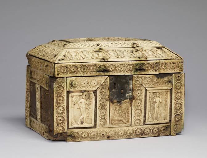 | Keywords: Byzantine - Box with Scenes from the Fall of Adam and Eve and the Story of Joseph - Walters 71295 - Three Quarter (2).jpg The front of this casket depicts the Fall of Adam and the Temptation of Eve flanking the Sorrowing Adam below the lockplate A fourth plaque on the back of the casket portrays Adam hiding behind a tree and covering his nudity The large rectangular plaque set into the casket's lid shows the Old Testament patriarch Jacob ordering his son Joseph to follow his brothers and the Angel of the Lord guiding his way These Old Testament images must have been intened as moral examples for the box's owner It was probably used in a private home for the safekeeping of valuables In Constantinople where urban life especially in the middle Byzantine period 843-1204 surpassed that of any western center luxury items such as boxes made of ivory and bone were in great demand and produced serially A number of details point toward such a system of manufacture many extant boxes have similar dimensions and often the borders were cut to size and used as fillers The plaque on the lid of this box with biblical scenes is smaller than the allotted space a sign that it was not made to measure Likewise the presence of peg holes prepared but not drilled through like those in the upper left border indicates that the plaque was part of a stockpile and not custom made These techniques allowed workshops to produce more affordable wares thus meeting the needs of a larger market The wealthier patrons might order a custom-made box covered in ivory plaques consumers of more modest means could purchase a box decorated with the plaques and strips of carved bone that the workshop kept in stock century 10 11 Medieval bone ivory wood cm 18 7 27 8 17 9 accession number 71 295 7841 Henry Walters city Baltimore Walters Art Museum Henry Walters Acquired by Henry Walters 1926 Translation Jacob Sending Joseph out to His Brothers Angel of the Lord The Transgression of Adam The Snake Speaking to Eve Early Christian and Byzantine Art Baltimore Museum of Art Baltimore 1947 place of origin Constantinople present-day Istanbul Turkey <gallery> File Byzantine - Box with Scenes from the Fall of Adam and Eve and the Story of Joseph - Walters 71295 - Three Quarter jpg </gallery> Walters Art Museum license Byzantine ivory in the Walters Art Museum Decorative and applied arts of Byzantine Empire Reliefs of Temptation of Adam and Eve Media contributed by the Walters Art Museum needs category review |