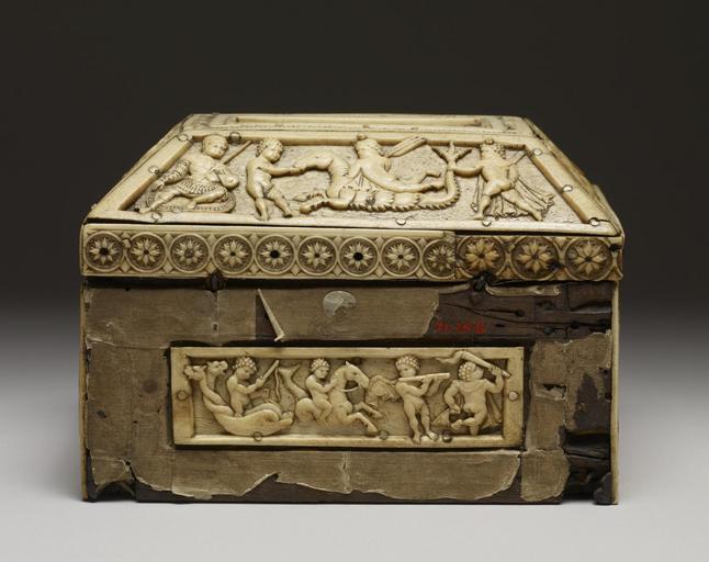 | Keywords: Byzantine - Casket with Images of Cupids - Walters 71298 - Back.jpg This finely carved ivory casket is decorated with curly-haired erotes cupids in the guise of warriors dancers and musicians The lid shows two in equestrian combat while the trapezoidal panel in front shows a group of four erotes and a centaur dancing and playing musical instruments The rectangular plaque on the casket's front features an eros playing a harp on a stand a chariot drawn by panthers and two other erotes playing musical instruments century 10 Medieval bone ivory wood cm 12 6 18 5 13 5 accession number 71 298 31653 Bought in Italy Edward Joseph London ca 1888 by purchase Sale Christie's London May 6 1890 no 1003 and February 1894 no 357 Isaac Falcke London 1894 by purchase Sale Christie's London April 19 1910 no 166 Jacques Seligmann Paris 1910 by purchase Henry Walters city Baltimore Walters Art Museum Henry Walters Acquired by Henry Walters 1910 Early Christian and Byzantine Art Baltimore Museum of Art Baltimore 1947 Ivory The Sumptuous Art The Walters Art Gallery Baltimore 1983-1984 The Taste of Maryland Art Collecting in Maryland 1800-1934 The Walters Art Gallery Baltimore 1984 place of origin Constantinople present-day Istanbul Turkey Walters Art Museum license Byzantine ivory in the Walters Art Museum Decorative and applied arts of Byzantine Empire Media contributed by the Walters Art Museum needs category review |