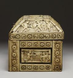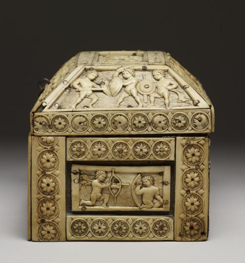 | Keywords: Byzantine - Casket with Images of Cupids - Walters 71298 - Left Side.jpg This finely carved ivory casket is decorated with curly-haired erotes cupids in the guise of warriors dancers and musicians The lid shows two in equestrian combat while the trapezoidal panel in front shows a group of four erotes and a centaur dancing and playing musical instruments The rectangular plaque on the casket's front features an eros playing a harp on a stand a chariot drawn by panthers and two other erotes playing musical instruments century 10 Medieval bone ivory wood cm 12 6 18 5 13 5 accession number 71 298 31653 Bought in Italy Edward Joseph London ca 1888 by purchase Sale Christie's London May 6 1890 no 1003 and February 1894 no 357 Isaac Falcke London 1894 by purchase Sale Christie's London April 19 1910 no 166 Jacques Seligmann Paris 1910 by purchase Henry Walters city Baltimore Walters Art Museum Henry Walters Acquired by Henry Walters 1910 Early Christian and Byzantine Art Baltimore Museum of Art Baltimore 1947 Ivory The Sumptuous Art The Walters Art Gallery Baltimore 1983-1984 The Taste of Maryland Art Collecting in Maryland 1800-1934 The Walters Art Gallery Baltimore 1984 place of origin Constantinople present-day Istanbul Turkey Walters Art Museum license Byzantine ivory in the Walters Art Museum Decorative and applied arts of Byzantine Empire Media contributed by the Walters Art Museum needs category review |