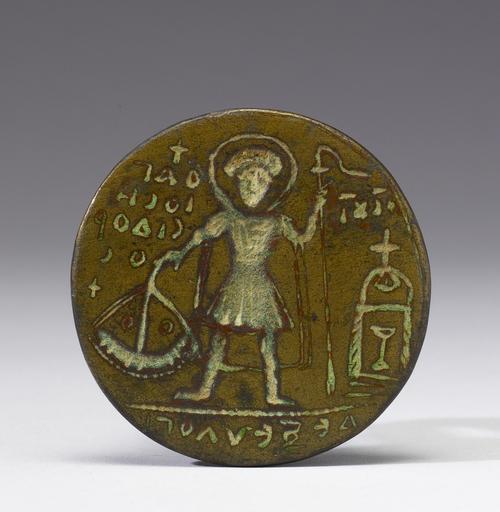| Keywords: Byzantine - Pilgrim Stamp of Saint Isidore - Walters 54230.jpg St Isidore was martyred on the Greek island of Chios in AD 251 The well into which his body was thrown later became a healing shrine represented at the right The ship to the left refers to Isidore's role as patron saint of sailors as well as to the ships that carried pilgrims to his island shrine This stamp used to produce pilgrim tokens has a backward inscription that becomes legible when imprinted in clay century 6 Late Antique bronze cm 5 9 6 3 8 accession number 54 230 22682 Dikran Kelekian Constantinople and Paris date of acquisition unknown by purchase Henry Walters city Baltimore Walters Art Museum Henry Walters Acquired by Henry Walters 1912 Translation inscribed in reverse + Saint Isidore / Jesus Christ / Receive a blessing Early Christian and Byzantine Art Baltimore Museum of Art Baltimore 1947 Sacred Souvenirs Byzantine Pilgrimage Art Dumbarton Oaks Washington 1982 Treasures of Heaven The Cleveland Museum of Art Cleveland; The Walters Art Museum Baltimore; The British Museum London 2010-2011 place of origin Chios Greece Walters Art Museum license Byzantine and Early Russian art in the Walters Art Museum Decorative and applied arts of Byzantine Empire Media contributed by the Walters Art Museum needs category review |