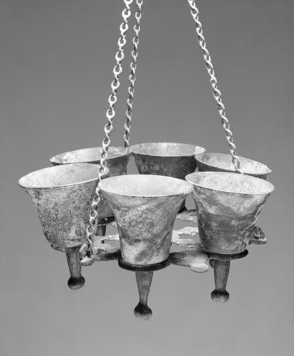 | Keywords: Byzantine - Polycandelion with Glass Lamps - Walters 542466 - View A.jpg Whether in a church adorned with stained-glass windows or in a space with only small openings in the walls the light entering from outside would have mingled with flickering oil lamps and candles inside illuminating some areas of painted or mosaic-clad walls while leaving other spaces dark Candles were set into candlesticks placed on altars and on the floor supported by holders affixed to columns and wall Oil lamps could be suspended between the columns lining the nave or over the altar This example of a Byzantine chandelier or polycandelion Greek for many lights made around the seventh century consists of an openwork bronze disk with holes for seven glass lamps one in the center and six surrounding it Referring to the church of Hagia Sophia in Constantinople illuminated with similar hanging lamps the poet Paul the Silentiary wrote in 563 No words are sufficient to describe the illumination in the evening You might say that some nocturnal sun filled the majestic church with its light century 6 8 Late Antique bronze with traces of enamel or glass H of polycandelion with lamps and chain 18 7/16 x Diam 9 11/16 in 46 9 x 24 6 cm ; H of chain cm 41 ; H of each lamp ranges from 4 5/8 to 5 5/16 in 11 7 to 13 5 cm ; Diam of lamp cm 9 6 ; H of lamp stem cm 5 9 accession number 54 2466 21719 Heidi Vollmoeler Zurich by purchase Walters Art Museum 1965 by purchase Museum purchase 1965 3000 Years of Glass Treasures from The Walters Art Gallery The Walters Art Gallery Baltimore 1982 Lighting in Early Byzantium Dumbarton Oaks Washington 1984-1985 place of origin Eastern Mediterranean Walters Art Museum license Polycandela Decorative and applied arts of Byzantine Empire Byzantine and Early Russian art in the Walters Art Museum |