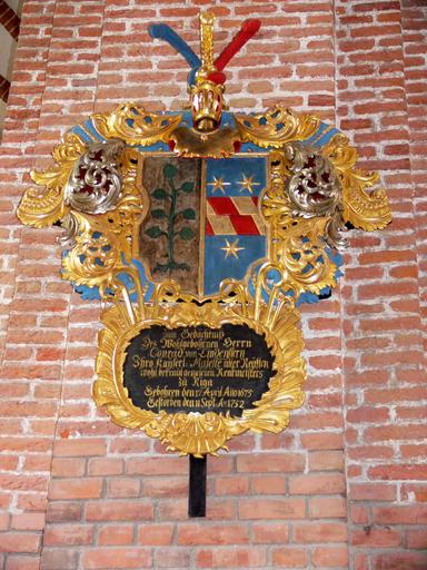 | Keywords: C. v. Lindenstern.JPG Coat of arms of Conrad von Lindenstern kaiserlicher Rentmeister in Riga 1675 ”1752 In der Kirche St Peter in Riga own 2012-06-02 Christian Bickel PD-old Hatchments in Church of Saint Peter in Riga Targes heraldic shields Heraldic helmets affronty Ostrich feathers in crest Trees in heraldry 3 six rays Or in heraldry Dimidiation in heraldry Fingalo |