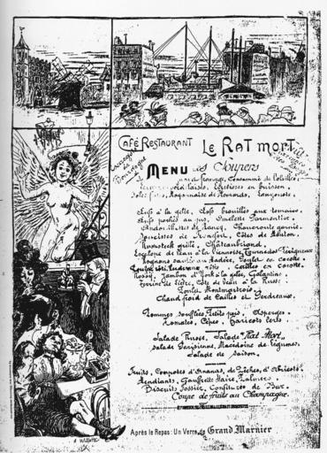 Keywords: CaféRestaurant-RatMort.jpg fr Carte de menu du Café Restaurant Rat Mort Via Cercle Coecilia 1998 A Willotte 1896 PD-old Food menus in Paris 1896 in Paris Café du Rat Mort