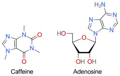 Keywords: Caffeine and adenosine.svg Chemical structure of Caffeine and Adenosine 2006-08-20 own assumed Icey derivative works Caffeine and adenosine-fr svg Caffeine Antiarrhythmic agents