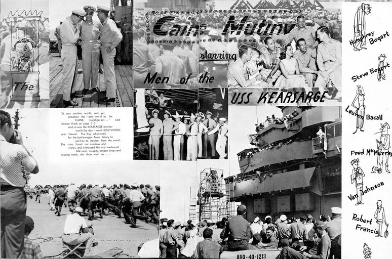 | Keywords: Caine Mutiny Cruisebook Panorama.jpg en USS Kearsarge CVA-33 cruise book 1953 - Caine Mutiny filming 1953 U S Navy photo http //navysite de/cruisebooks/cv33-53/028 htm from the http //navysite de/cruisebooks/cv33-53/index_003 htm USS Kearsarge CVA-33 1953-54 cruise book available at http //navysite de/cruisebooks/index html Navysite de U S Navy other versions PD-USGov-Military-Navy Lauren Bacall in 1953 Humphrey Bogart 1953 in Hawaii Fred MacMurray Van Johnson Robert Francis Aboard USS Kearsarge CV-33 The Caine Mutiny film Pearl Harbor in the 1950s |