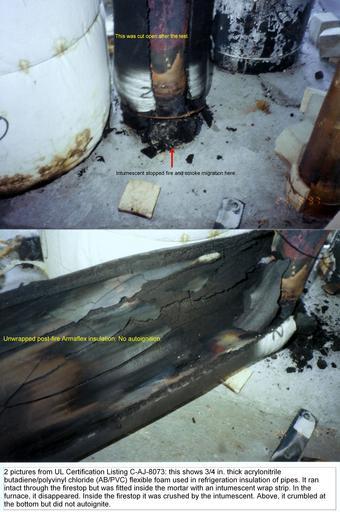 | Keywords: Caj8073 armaflex needs intumescent.jpg Post fire test pictures showing how 3/4 in thick acrylonitrile butadiene/polyvinyl chloride AB/PVC flexible foam pipe covering can go through the seal unhindered It was wrapped inside the mortar with an intumescent wrap strip which stopped the fire There was no autoignition of the insulation due to flame retardants inherent in its organic composition Own 2007-06-25 Achim Hering Pipe covering Fire testing Firestops Cable trays Plumbing Cement Thermal insulation Construction materials Firestop mortar Intumescents CAJ 8073 3M Fire Barrier Mortar FS195 |