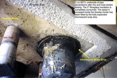 Keywords: Caj8073 fibreglass afterwards.jpg Underside of Assembly for UL certification listing C-AJ-8073 Configuration D the mortar is intact the fibreglass has disappeared and the intumescent wrap strip has occupied the space formerly held by the insulation Own 2007-06-25 Achim Hering Firestops Cable trays Fire testing Concrete Plumbing Cement Thermal insulation Construction materials Fibreglass Intumescents CAJ 8073 FS195 3M Fire Barrier Mortar |