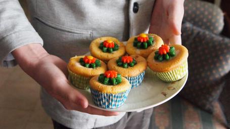 Keywords: cake cupcake flower flowers marzipan handing out baking orange board boy child