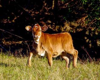 Keywords: calf cattle stock brown white young standing field pasture paddock farm beef rural cow bull queensland australia
