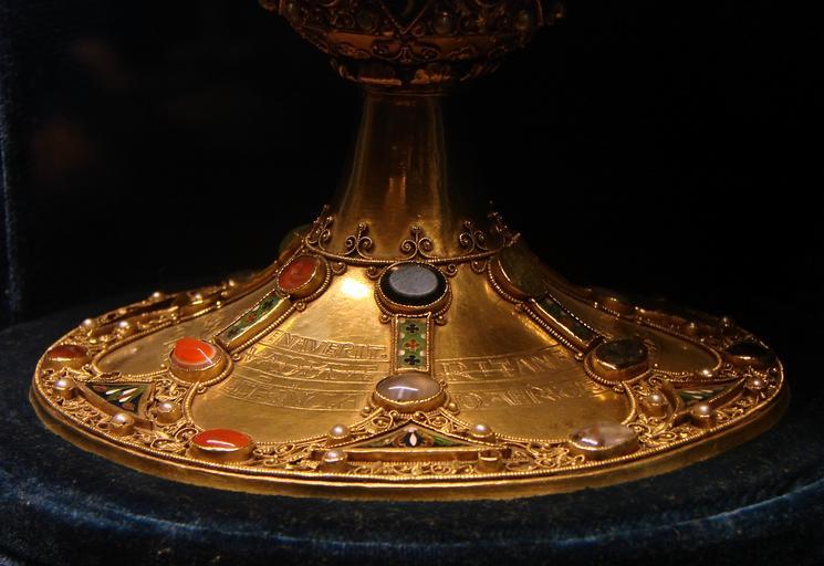 Keywords: Calice du Sacre Reims 311209 02.jpg Calice du sacre fin du XIIème siècle Palais du Tau Trésor de la cathédrale de Reims détail Or travail de filigrane et granulations émaux perles pierres fines et pierres précieuses Il fut envoyé à la fonte à la Monnaie de Paris et heureusement oublié puis exposé au Musée des Antiques de la Bibliothèque Nationale à Paris Il fut renvoyé à Reims en 1861 sous Napoléon III L'intaille de gauche sur cornaline représente le capricorne Le pied du calice porte l'inscription Quicumque hunc calicem invadiaverit vel ab ecclesia remensi aliqui modo alianeverit anathema sit fait amen quiconque s'emparera de ce calice de l'église de Reims de quelque façon que ce soit qu'il soit frappé d'anathème Amen Chalice of the coronation in Reims |
