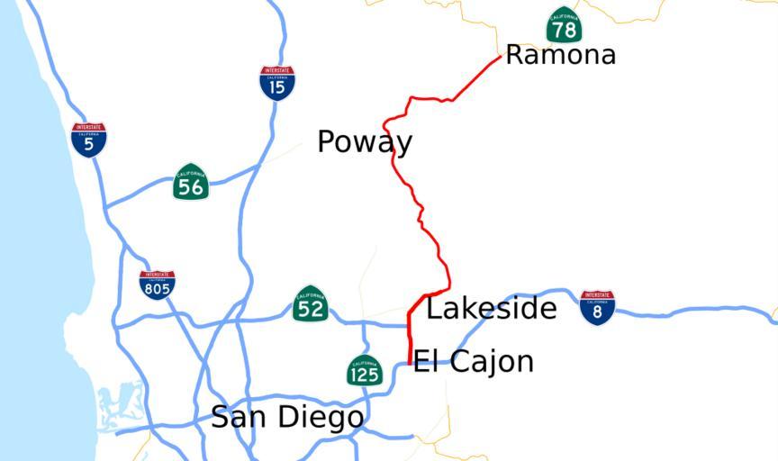 | Keywords: California State Route 67.svg en This is a map of State Route 67 in California created in w Quantum GIS http //www fhwa dot gov/planning/processes/tools/nhpn/ NHPN http //atlas ca gov/ California State GIS User Rschen7754 2012-12-01 California State Route 67 Road maps of state highways in California 067 |