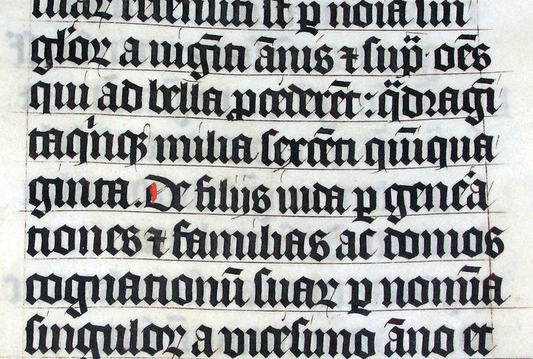 | Keywords: Calligraphy.malmesbury.bible.arp.jpg Calligraphy in a Latin Bible of AD 1407 on display in Malmesbury Abbey Wiltshire England The Bible was hand written in Belgium by Gerard Brils for reading aloud in a monastery <br> The text on display is Latin and it comes from the book of Numbers Num 1 24-26 The text is including the first line which is not entirely visible suarum recensiti sunt per nomina sin<br>gulorum a viginti annis et supra omnes<br> qui ad bella procederent 25 quadragin<br>ta quinque milia sexcenti quinqua<br>ginta 26 De filiis Iuda per genera<br>tiones et familias ac domos<br> cognationum suarum per nomina<br>singulorum a vicesimo anno et <small>of their fathers according to the number of the names from twenty years old and upward all that were able to go forth to war; 25 Those that were numbered of them even of the tribe of Gad were forty and five thousand six hundred and fifty 26 Of the children of Judah by their generations after their families by the house of their fathers according to the number of the names from twenty years old and</small> It is interesting to note the scribal abbrevations which are used thoroughly such as the symbol for -rum see the end of the first word on the second line and the use of bars over vowels to indicate a missing n viginti annus second line again and of course the symbol for et although it is written in full near the end of the text Other abbrevations include the modified 'p' for 'per' and the use of dots above characters to indicate missing letters sup with dots instead of supra 2005-02 own Adrian Pingstone Arpingstone Calligraphy 1407 texts Taken with Olympus C-750UZ Old Testament Bible manuscripts Book of Numbers Textura Malmesbury bible |