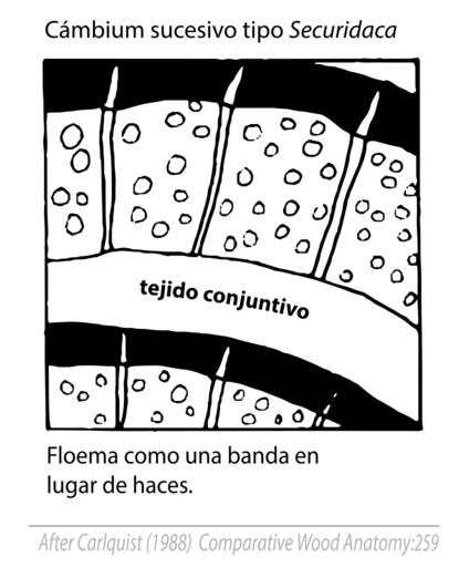 Keywords: Cambial Variants (Anomalous Secondary Growth) Fig. 8.2 succesive cambium (centrifugal) Securidaca type (in Spanish).svg Fig 8 2 Types of successive cambial activity The products of a primary thickening meriste are a series of prodesmogen strands that may produce very little e g Pisonia or much more Atriplex secondary xylem Origin of first primary thickening meristem may be from cortex or from parenchyma yielded to outside by desmogic cambium Origin of second and subsequent primary thickening meristems is from parenchyma derived from desmogic cambia Middle row various centrifugal types S Carlquist 1988 p 259 Fig 8 2 Chapter 8 Cambial Variants Anomalous Secondary Growth In Comparative Wood Anatomy Part of the series Springer Series in Wood Science Springer Verlag Berlin Heidelberg 1988 S Carlquist 1988 Tracing data from a scientific diagram taken from primary scientific literature not the scope of copyright laws PD-ineligible Equivalent to cc-0 Wood anatomy Securidaca |