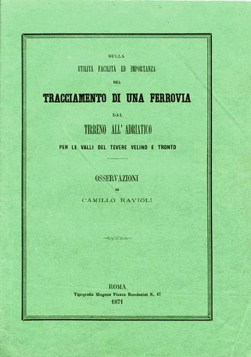 | Keywords: Camillo Ravioli - Sulla utilità facilità ed importanza del tracciamento di una ferrovia dal Tirreno all'Adriatico per le valli del Tevere-Velino e Tronto (1871) - copertina.jpg it Copertina del libro Sulla utilità facilità ed importanza del tracciamento di una ferrovia dal Tirreno all'Adriatico per le valli del Tevere-Velino e Tronto di Camillo Ravioli pubblicato nel 1871 en Front cover of the book On the usefulness easiness and importance of outlining a railway from the Tyrrhenian to the Adriatic Sea across the Tiber-Velino and Tronto valleys by Camillo Ravioli published in 1871 1871 https //www halleyweb com/c057003/zf/index php/servizi-aggiuntivi/index/index/idservizio/20021 Documentazione dell'archivio di Stato di Rieti ospitata sul sito istituzionale del Comune di Antrodoco Camillo Ravioli 1824-1907 other versions PD-old-70-1923 Planned Salaria railway Books about rail transport |