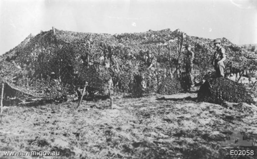 | Keywords: Camouflaged8inchHowitzerAustralian1stSiegeBatteryOctober1917.jpeg A 8 inch howitzer of the 1st Australian Siege Battery at Gordon Road near Half Way House a position taken up on 6 October 1917 The heavy camouflage was necessary owing to the exposed position of the gun and only 4000 feet from the enemy front line The battery was here subject to enemy action and during the fortnight it occupied this position suffered twelve casualties <br>Left to right Corporal S J Downey; Bombardier Allman; Lieutenant W W Whittle <br>This is an original Paget Plate negative The same image is available in colour and is held at P03631 179 E02058 1917-10 Photographer Copyright clear PD-AustraliaGov watermark BL 8 inch Howitzer Mk VI - VIII World War I forces of Australia in Belgium World War I camouflage Black and white photographs |