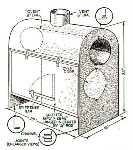 | Keywords: drawing sketch cartoon illustration indoor white background text Popular Science July 1937 Stove Canopy. The canopy illustrated, according to its designer, Harold P. Rykken, will get rid of most of the cooking odors and gas fumes from the trailer stove, and when the weather is chilly, it can easily be converted into a heater. The material is 26-gauge galvanized or black iron. To use as a heater, the front shutter is slipped into the side channels and then up into the upper channel. The 9-in. tube near the top of the campy is for additional heating surface and can be used for warming small dishes when the “oven” doors are closed. If this feature is omitted, some expense may be saved and the canopy will gain slightly in efficiency, but more than 5 sq. ft. of heating surface is lost. The vent should run straight tip, and the collar may have to be placed off center in order to avoid a ceiling joist. Install a 6-in. damper in the collar and a ventilator on the roof. In most cases the canopy will have to be made in a sheet-metal shop. haw-creek.com/improved-trailer-fittings-make-life-on-whee... Popular Science July 1937 Stove Canopy. The canopy illustrated, according to its designer, Harold P. Rykken, will get rid of most of the cooking odors and gas fumes from the trailer stove, and when the weather is chilly, it can easily be converted into a heater. The material is 26-gauge galvanized or black iron. To use as a heater, the front shutter is slipped into the side channels and then up into the upper channel. The 9-in. tube near the top of the campy is for additional heating surface and can be used for warming small dishes when the “oven” doors are closed. If this feature is omitted, some expense may be saved and the canopy will gain slightly in efficiency, but more than 5 sq. ft. of heating surface is lost. The vent should run straight tip, and the collar may have to be placed off center in order to avoid a ceiling joist. Install a 6-in. damper in the collar and a ventilator on the roof. In most cases the canopy will have to be made in a sheet-metal shop. haw-creek.com/improved-trailer-fittings-make-life-on-whee... |