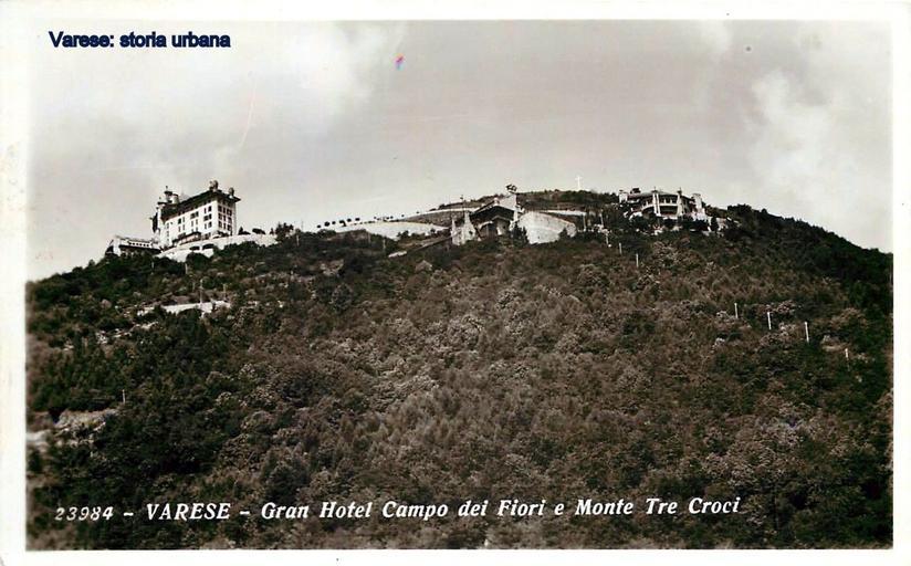 | Keywords: Il complesso turistico del Campo dei Fiori. A sinistra il Grand Hotel (terminato nel 1912) al centro la stazione a monte della funicolare e a destra il Ristorante Campo dei Fiori (entrambe completate nel 1911). Tutte e tre le opere sono state progettate dall'arch. Giuseppe Sommaruga tra il 1908 e il 1910. In alto le tre croci (1901). varese campodeifiori |