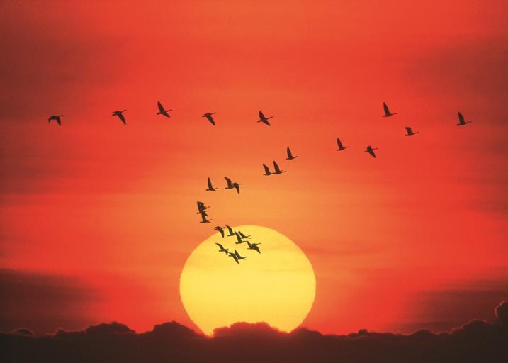 Keywords: canada geese flying formation flight sunset orange sky waterfowl flock migration fly