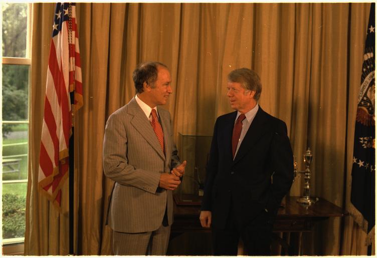 | Keywords: Canadian President Pierre Trudeau with Jimmy Carter in the Oval Office. - NARA - 176148.tif Scope and content General notes 176148 Local identifier President 1977-1981 Carter White House Staff Photographers 01/20/1977 - 01/20/1981 Jimmy Carter Library NLJC 441 Freedom Parkway Atlanta GA 30307-1498 1977-09-09 Record group Collection JC-WHSP Carter White House Photographs Collection 01/20/1977 - 01/22/1981 Record group ARC 1120 Carter White House Photographs Presidential compiled 01/20/1977 - 01/22/1981 Series ARC 173341 File unit Brzez Jimmy Carter 4-13; Pierre Trudeau of Canada 09/09/1977 - 09/09/1977 File unit ARC 176146 Variant control numbers NAIL Control Number NLC-WHSP-C-02672-15A yes Other versions NARA-cooperation PD-USGov Pierre Elliott Trudeau Jimmy Carter with national leaders |