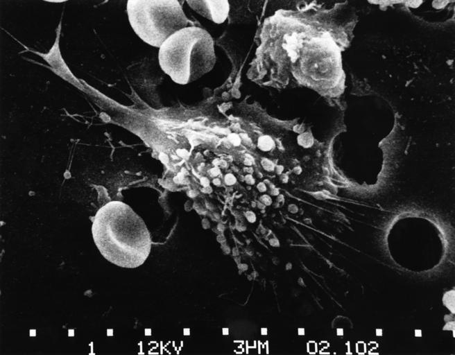 Keywords: Cancer cells- death (step 1).jpg Step-one of a six-step sequence of the death of a cancer cell A cancer cell has migrated through the holes of a matrix coated membrane from the top to the bottom simulating natural migration of a invading cancer cell between and sometimes through the vascular endothelium Notice the spikes or pseudopodia that are characteristic of an invading cancer cell step 1 Photo magnification x12 000 See also http //visuals nci nih gov/details cfm imageid 2369 http //visuals nci nih gov/details cfm imageid 2370 http //visuals nci nih gov/details cfm imageid 2371 http //visuals nci nih gov/details cfm imageid 2372 http //visuals nci nih gov/details cfm imageid 2373 Topics/Categories Cells or Tissue Abnormal Cells or Tissue Type B W Photo Source Dr Raowf Guirguis National Cancer Institute Susan Arnold Photographer 2368 1988-10 Reuse Restrictions None - This image is in the public domain and can be freely reused Please credit the source and/or author listed above Susan Arnold Photographer PD-USGov-HHS-NIH Media from National Cancer Institute Visuals Online Images uploaded by Fæ |