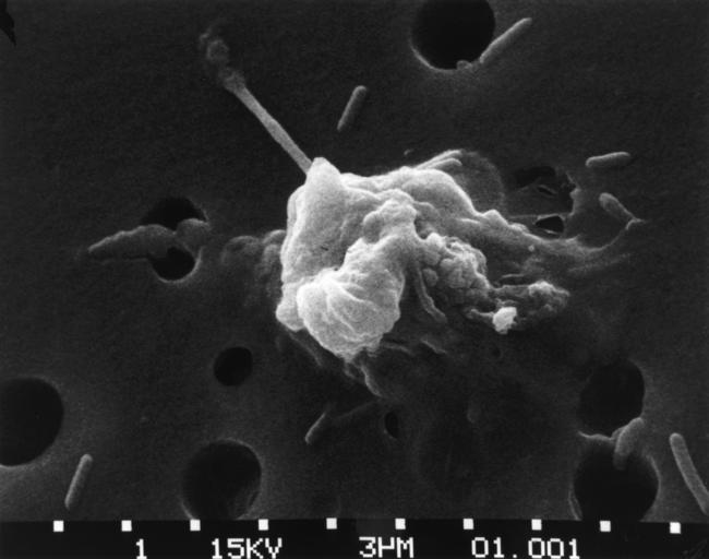 Keywords: Cancer cells- death (step 6).jpg Step-six of a six-step sequence of the death of a cancer cell A cancer cell has migrated through the holes of a matrix coated membrane from the top to the bottom simulating natural migration of a invading cancer cell between and sometimes through the vascular endothelium The cancer cell then loses its morphology shrinks up and dies step 6 Photo magnification x14 000 See also http //visuals nci nih gov/details cfm imageid 2369 http //visuals nci nih gov/details cfm imageid 2370 http //visuals nci nih gov/details cfm imageid 2371 http //visuals nci nih gov/details cfm imageid 2372 http //visuals nci nih gov/details cfm imageid 2373 Topics/Categories Cells or Tissue Abnormal Cells or Tissue Type B W Photo Source Dr Raowf Guirguis National Cancer Institute Susan Arnold Photographer 2373 1988-10 Reuse Restrictions None - This image is in the public domain and can be freely reused Please credit the source and/or author listed above Susan Arnold Photographer PD-USGov-HHS-NIH Media from National Cancer Institute Visuals Online Images uploaded by Fæ |