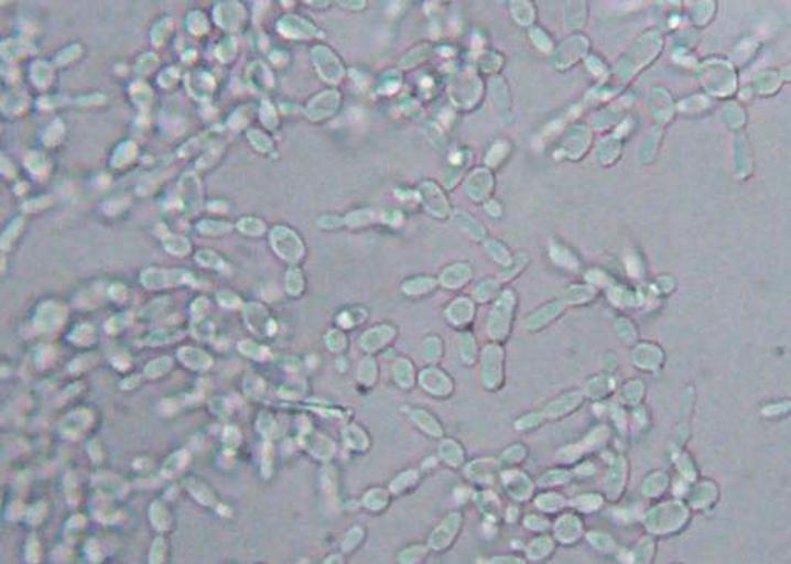 Keywords: Candida wet mount.jpg en Wet mount showing several yeast like budding cells identified later as Candida Own Microrao date Microscopic images of yeast Candida