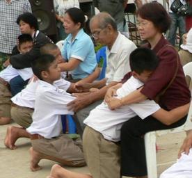 Keywords: Candidate for the Buddhist novice in the Buddhist religion priesthood 05.jpg children embraces mother with the love own 2007 Ordination at Wat Khung Taphao Buddhist child monks ordination of Thailand Buddhist traditions in Wat Khung Taphao