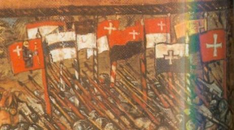 | Keywords: Cantonal flags Nancy 1477 1513.jpg en Depiction of the Swiss confederate flags at the battle of Nancy 1477 Detail of the plate depicting the battle in the Luzerner Chronik of Diebold Schilling 1513 All flags of the Eight Cantons are shown but the flags of Berne and Uri omit the heraldic animal showing only the cantonal colours In addition the flags of Fribourg and Solothurn are shown at the time not yet full members who would join the confederacy in the aftermath of this battle in 1481 The flag of the city of Basel is shown separately behind the confederate flags not included in this detail Each flag has the white confederate cross attached those of Schwyz Lucerne and Zug in the center the others in the top corner at the host except for Glarus where it is in the top corner at the fly apparently for reasons of space and for Zürich which is partially obscured behind Zug and Glarus so that no cross is visible but the red Schwenkel at the top of the flag of Zürich is visible 1513 Luzerner Chronik detail of File Deutsche Geschichte5-290 jpg Creator Diebold Schilling PD-old-100 Uploaded with UploadWizard Flags and Coats of arms used by Swiss soldiers 1300-1550 |