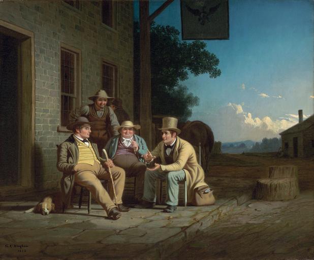 | Keywords: George Caleb Bingham was active in Missouri politics for most of his adult life. Canvassing for a Vote reflects his full faith in the democratic system, even as he recognized its shortcomings. Set in the artist’s hometown of Arrow Rock, Missouri, the composition shows a politician and trio of potential voters in a solid pyramid at the center of the painting, representing the campaign process at work. Bingham also suggests some of the problems of 1850s American politics. A sleeping dog and a man whose back is turned to the solicitation may imply political disenfranchisement and disinterested citizens. Bingham may also be commenting on the dubious character of certain politicians by placing the horse’s rump in line with the canvasser’s head. Read more at Canvassing for a Vote - 1852. (Google Art Project) George Caleb Bingham was active in Missouri politics for most of his adult life. Canvassing for a Vote reflects his full faith in the democratic system, even as he recognized its shortcomings. Set in the artist’s hometown of Arrow Rock, Missouri, the composition shows a politician and trio of potential voters in a solid pyramid at the center of the painting, representing the campaign process at work. Bingham also suggests some of the problems of 1850s American politics. A sleeping dog and a man whose back is turned to the solicitation may imply political disenfranchisement and disinterested citizens. Bingham may also be commenting on the dubious character of certain politicians by placing the horse’s rump in line with the canvasser’s head. Read more at Canvassing for a Vote - 1852. (Google Art Project) |
