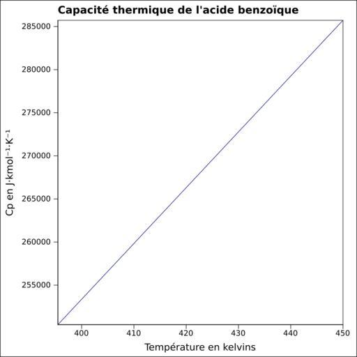 | Keywords: Capacité thermique acide benzoïque.svg fr Capacité thermique liquide calculée d'après <br/> Robert H Perry et Donald W Green Perry's Chemical Engineers' Handbook McGraw-Hill USA 1997 7e éd 2400 p ISBN 0-07-049841-5 p 2-170 own Epop 2010-06-28 Created with Gnumeric Heat capacity |