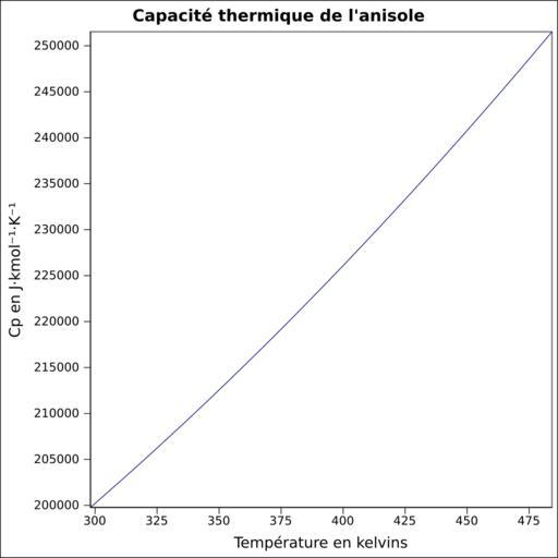 | Keywords: Capacité thermique anisole.svg fr Capacité thermique liquide calculée d'après <br/> Robert H Perry et Donald W Green Perry's Chemical Engineers' Handbook McGraw-Hill USA 1997 7e éd 2400 p ISBN 0-07-049841-5 p 2-170 own Epop 2010-06-28 Created with Gnumeric Heat capacity |