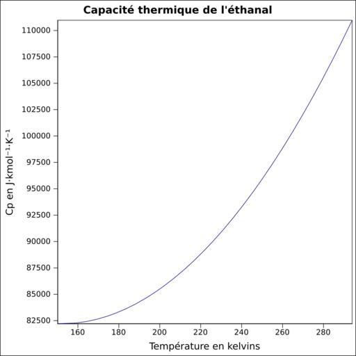 | Keywords: Capacité thermique éthanal.svg fr Capacité thermique liquide calculée d'après <br/> Robert H Perry et Donald W Green Perry's Chemical Engineers' Handbook McGraw-Hill USA 1997 7e éd 2400 p ISBN 0-07-049841-5 p 2-170 own Epop 2010-06-28 Created with Gnumeric Heat capacity |