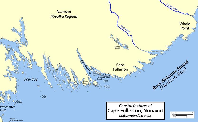 | Keywords: Cape Fullerton.png Map of Cape Fullerton Nunavut Canada and surrounding areas including Whale Point Daly Bay Bernheimer Bay Fullerton Harbour Winchester Inlet Depot Island Pikiulerk Bailey Islands Walrus Island Poillon Point Major Island Store Island Beacon island Barrel Island Lake of Islands Borden River and Mistake Creek Own 2008 Cbaer Check categories 2008 November 11 en wikipedia Cape_Fullerton Maps of Nunavut | ||||