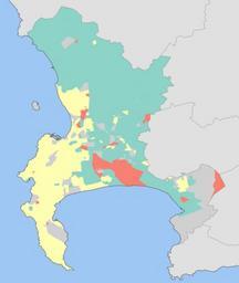 | Keywords: Cape Town 2001 dominant language map.svg 8dd3c7 Afrikaans ffffb3 English fb8072 isiXhosa d0d0d0 No language dominant Statistics South Africa's Census 2001 is the source of the basic population data The map results from my own processing of the data Htonl 2010-02-15 Htonl The following license applies to the population data on which the map is based http //www statssa gov za/copyrightdisclaimer asp the user acknowledges Stats SA as the source of the basic data wherever they process apply utilise publish or distribute the data and also that they specify that the relevant application and analysis where applicable result from their own processing of the data The following tag applies to the map itself Linguistic maps of South Africa Maps of Cape Town Maps of metropolitan areas in South Africa Maps by Htonl |