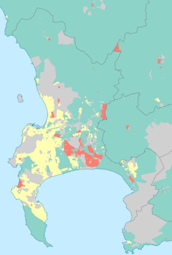 | Keywords: Cape Town 2011 dominant language map.svg 8dd3c7 Afrikaans ffffb3 English fb8072 isiXhosa d0d0d0 No population or no language dominant Statistics South Africa's Census 2011 is the source of the basic population data The map results from my own processing of the data Htonl 2015-09-26 Htonl The following license applies to the population data on which the map is based http //www statssa gov za/copyrightdisclaimer asp the user acknowledges Stats SA as the source of the basic data wherever they process apply utilise publish or distribute the data and also that they specify that the relevant application and analysis where applicable result from their own processing of the data The following tag applies to the map itself Linguistic maps of South Africa Maps of Cape Town Maps of metropolitan areas in South Africa Maps by Htonl |