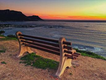 Keywords: cape town camps bay south africa bench sunset sea ocean mountain beach atlantic coast coastline tourism panorama holiday panoramic destination