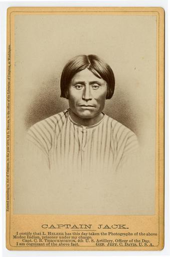 Keywords: captain jack captainjack modoc 1837-1873 18371873 heller louis h. louish pub.: watkins' pubwatkins yosemite art gallery artgallery kientpoos kintpuash people photo border picture frame text Repository: California Historical Society Collection: Photographic portraits of Modoc Indians of the Modoc War Photographer: Heller, Louis Herman Date: 1873 General note: Printed on mounts: I certify that L. Heller has this day taken the photographs of the above Modoc Indian prisoner under my charge. Capt. C.B. Throckmorton, 4th U.S. Artillery, Officer of the Day. I am cognizant of the above fact. Gen. Jeff. C. Davis, U.S.A. General note: Photos were published by Carleton E. Watkins. Watkins' Yosemite Art Gallery advertisement on verso. Format: Carte de visite Call Number: PC 006 Digital object ID: PC 006_01.jpg Preferred citation: Captain Jack, Photographic portraits of Modoc Indians of the Modoc War, PC 006, courtesy, California Historical Society, PC 006_01.jpg Repository: California Historical Society Collection: Photographic portraits of Modoc Indians of the Modoc War Photographer: Heller, Louis Herman Date: 1873 General note: Printed on mounts: I certify that L. Heller has this day taken the photographs of the above Modoc Indian prisoner under my charge. Capt. C.B. Throckmorton, 4th U.S. Artillery, Officer of the Day. I am cognizant of the above fact. Gen. Jeff. C. Davis, U.S.A. General note: Photos were published by Carleton E. Watkins. Watkins' Yosemite Art Gallery advertisement on verso. Format: Carte de visite Call Number: PC 006 Digital object ID: PC 006_01.jpg Preferred citation: Captain Jack, Photographic portraits of Modoc Indians of the Modoc War, PC 006, courtesy, California Historical Society, PC 006_01.jpg