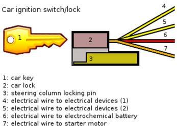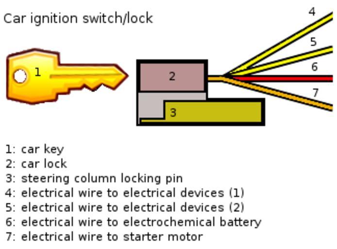 Keywords: Car ignition and steering wheel lock.png en A schematic showing the ignition/steering wheel lock of a car Note that the 4 wires are not connected from a single wire they are seperate the schematic was made how it is because I wished to clarify that they run next to each other rather than under each other when viewed from the side Note that 4 is generally connected to the largest power consumers ie main lights rear window heater windscreen wipers cigarette lighter 5 generally connects to smaller power consumers Note also that most car ignition/steering wheel locks also have 4 modes <br> In mode 0 main engine is off or is stopped if the engine was already on 4 5 7 are not connected to 6<br> In mode 1 4 is connected to 6<br> In mode 2 4 and 5 are connected to 6<br> In mode 3 4 5 and 7 are connected to 6; note that this 3rd mode is springed meaning that the key will spring back to mode 2 upon release of the key This is because the powering of the starting engine is no longer wanted once the main internal combustion engine has kicked on <br> The schematic was made based on the http //commons wikimedia org/wiki/File KEY png image and by following a schematic from the book Zo werkt uw auto by Rien Tholenaar and Carel Zaal own KVDP 2010-07-17 Automobile parts Ignition systems |