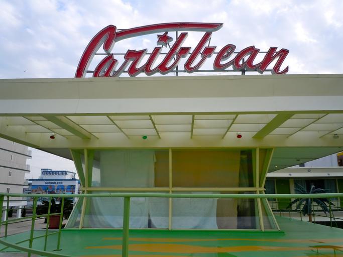 | Keywords: Caribbean 1 NRHP NJ.jpg en Caribbean Motel on NRHP since August 24 2005 At 5600 Ocean Ave in Wildwood Crest south of Wildwood New Jersey in Cape May County Built 1958 in a distinctive modern Las Vegas Jetsons style aka Googie style or locally Doo-Wop Second story office photographer facing south Note the tilted glass bright colors huge neon sign and the overhang without a roof See also Chateau Bleu for another example of this style nearby 2011-04-23 own Smallbones cc-zero Uploaded with UploadWizard Caribbean Motel |