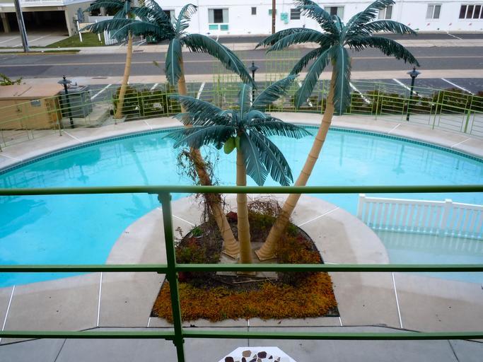 | Keywords: Caribbean 3 NRHP NJ.jpg en Caribbean Motel on NRHP since August 24 2005 At 5600 Ocean Ave in Wildwood Crest south of Wildwood New Jersey in Cape May County Built 1958 in a distinctive modern Las Vegas Jetsons style aka Googie style or locally Doo-Wop C shaped swimming pool taken from the 2nd floor balcony photographer facing north Note the plastic palm trees- typical of the Doo Wop style 2011-04-23 own Smallbones cc-zero Uploaded with UploadWizard Caribbean Motel Artificial palm trees | ||||