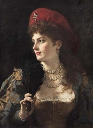 Keywords: Carl Ludwig Becker Damen-Halbbildnis.jpg Damenbildnis mit Fächer und Perlenschmuck Öl auf Leinwand signiert rückseitig alter Ausstellungs-Klebezettel von 1893 71 x 51 cm by 1893 oil canvas cm 71 51 object history exhibition history credit line accession number http //www auktion-bergmann de Auktionshaus Bergmann PD-old-100-1923 Images from Auktionshaus Bergmann Carl Ludwig Friedrich Becker Portraits with fans Necklaces in art