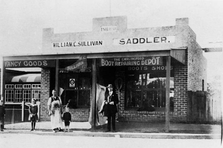 | Keywords: Carlingford NSW-Sullivan Saddler-c.1920.jpg William C Sullivan Saddler boot repairs c 1920s corner Pennant Hills Road and Church Street later Marsden Road Mobbs Hill Carlingford Road sign points to Pennant Hills Unidentified individuals Note the Returned Services badge on the lapel of the man on the right William Sullivan 'replaced' his wooden store with a brick version in 1915 as seen in this imageCumberland Argus and Fruitgrowers Advocate Sat 15 May 1915 p 8 Original publication Unknown<br/> Immediate source Copy negative of original image 1920 Unknown<br/> Life time Unknown In the public domain under Australian copyright law PD-Australia PD-URAA Original upload log en wikipedia Carlingford+NSW-Sullivan+Saddler-c 1920 jpg 2013-10-12 09 07 Roger Garland 640×426× 82937 bytes <nowiki>Uploading an old public-domain work using File Upload Wizard</nowiki> Carlingford New South Wales New South Wales in the 1920s Saddlers from Australia |