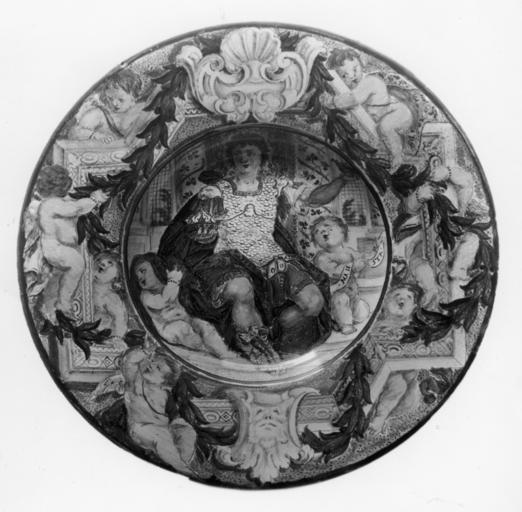 | Keywords: Carlo Antonio Grue - Plate with a Pastoral Landscape - Walters 481753.jpg This plate with a sunk center is painted in grey-blue grey-green and copper-green yellow ochre and manganese and is heightened with gold The marli is decorated with two putti one is asleep a rooster a bird insects and flowers within serpentine leaf scrolls In the center is a landscape with a gnarled tree in the foreground Behind the tree is a bridge on which a woman and child carrying a basket and bundle on their heads are followed by a barking dog The back is white between 1680 1700 Baroque earthenware with tin glaze maiolica cm 4 5 29 5 accession number 48 1753 18426 Sangiorgi Rome date and mode of acquisition unknown Henry Walters city Baltimore Walters Art Museum Henry Walters Acquired by Henry Walters 1930 place of origin Castelli Italy Walters Art Museum license Baroque art in the Walters Art Museum Carlo Antonio Grue Media contributed by the Walters Art Museum needs category review |