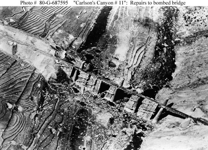 Keywords: Carlson's Canyon.jpg en Photograph Carlson's Canyon 11 taken on 30 March 1951 showing the bridge repaired with wooden cribbing It lacks only rails to be ready for service again The bridge was originally knocked out by Navy carrier planes on 3 March was repaired and again put out of service by air strikes on 15 March and would be revisited and totally destroyed on 2 April This railway bridge-tunnel complex was located south of Kilchu in northeastern Korea http //www history navy mil/photos/images/g600000/g687595c htm Official U S Navy Photograph no 80-G-687595 now in the collections of the National Archives USN 1951-03-30 PD-USGov-Military-Navy PD-USGov-Military-Navy Korean War Box cribs |