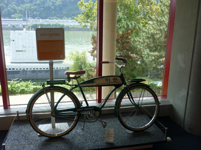 | Keywords: Carnegie Science Center 1955 Huffy Radiobike.JPG en The 1955 Huffy Radiobike on display at the Carnegie Science Center in Pittsburgh PA It had a built-in radio in the frame with batteries housed in the back The antenna was placed between the handlebars and pedals The radio was working on vacuum-tubes despite the fact that transistors were already available on the market This was a cost-saving measure since transistors were more expensive 2013-09-29 13 57 17 own Photojunkie No restrictions on publication Uploaded with UploadWizard Carnegie Science Center Vintage bicycles Huffy bicycles |