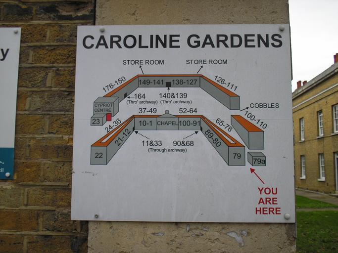 Keywords: Caroline Gardens Map.jpg Map of the Caroline Gardens Estate in Peckham South London UK This was originally built as the Licensed Victuallers Asylum in 1827 2006-12-10 own assumed Vaughan~commonswiki Caroline Gardens Signs in the London Borough of Southwark |