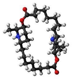 Keywords: Carpaine 3D ball.png Ball-and-stick model of the carpaine molecule an alkaloid found in papaya leaves Colour code 505050 Carbon C black<br> F0F0F0 Hydrogen H white<br> F51E1E Oxygen O red<br> 3C50FA Nitrogen N blue<br> 2011-06-13 own DS Visualizer Jynto talk Space-filling version cc-zero Alkaloids Piperidines Lactones Macrocyclic compounds Images by Jynto Ball-and-stick models |