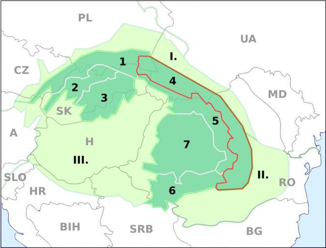 | Keywords: Carpathians Eastern Outer.svg Outer Eastern Carpathians outlined in red <br> 1 Outer Western Carpathians <br> 2 Central Western Carpathians <br> 3 Inner Western Carpathians <br> 4 Outer Eastern Carpathians <br> 5 Inner Eastern Carpathians <br>6 Southern Carpathians <br> 7 Apuseni West-Romanian Mountains and Transylvanian Plateau <br> I Subcarpathian depressions <br> II Romanian Lowlands <br> III Pannonian Basin <br>----<br> Zewnętrzne Karpaty Wschodnie w czerwonym konturze <br> 1 Zewnętrzne Karpaty Zachodnie <br> 2 Centralne Karpaty Zachodnie <br>3 Wewnętrzne Karpaty Zachodnie <br> 4 Zewnętrzne Karpaty Wschodnie <br> 5 Wewnętrzne Karpaty Wschodnie <br> 6 Karpaty Południowe <br> 7 Góry Zachodniorumuńskie i Wyżyna Transylwańska <br> I Podkarpacie <br> II Równiny Południoworumuńskie <br> III Kotlina Panońska Own PM / P 13 IX 2009 pl Polish language Wikipedia P SVG maps of Europe Maps of the Carpathian Mountains |