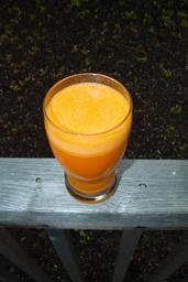Keywords: carrot juice glass cup outside deck wood health drink beverage blended smoothie orange juice carrot food raw fresh vegetarian vegan